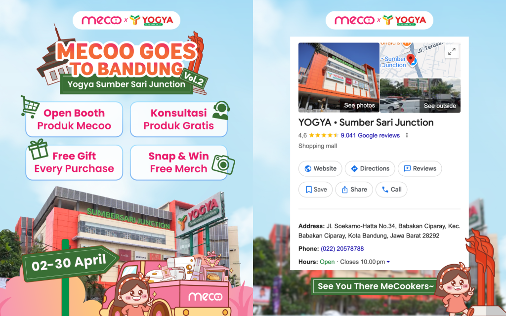 Warga Bandung, mana suaranya? 🔊 ✨ Mecoo balik lagi nih ke Bandung! Kali ini kita mampir di Yogya Sumber Sari Junction selama sebulan penuh dari tanggal 2 – 30 April. 🥳 Ada Open Booth, Promo Free Gift, dan Konsultasi juga. Tunggu apa lagi? Langsung meluncur ke lokasi sekarang! 🚗 💨