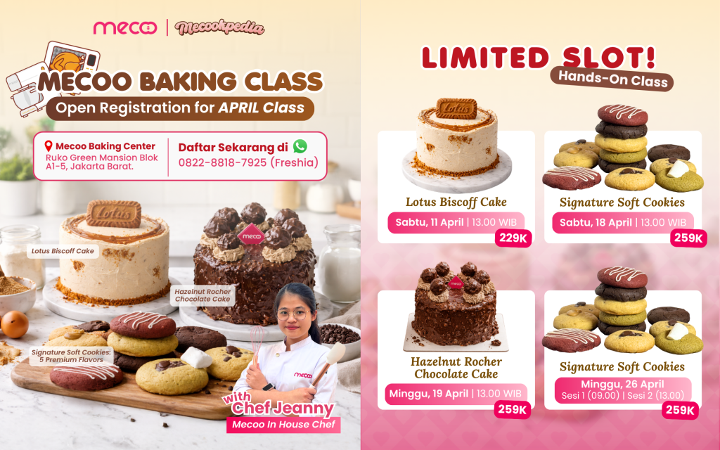 ❤ REGISTRASI MECOOKPEDIA APRIL 🥳 Kelas pertama setelah Ramadhan~📅sudah dibuka looh! MeCookers jangan sampai ketinggalan yaa. 🤩 Lokasi :📍 Mecoo Baking Center, Jakarta BaratPendaftaran :📱…