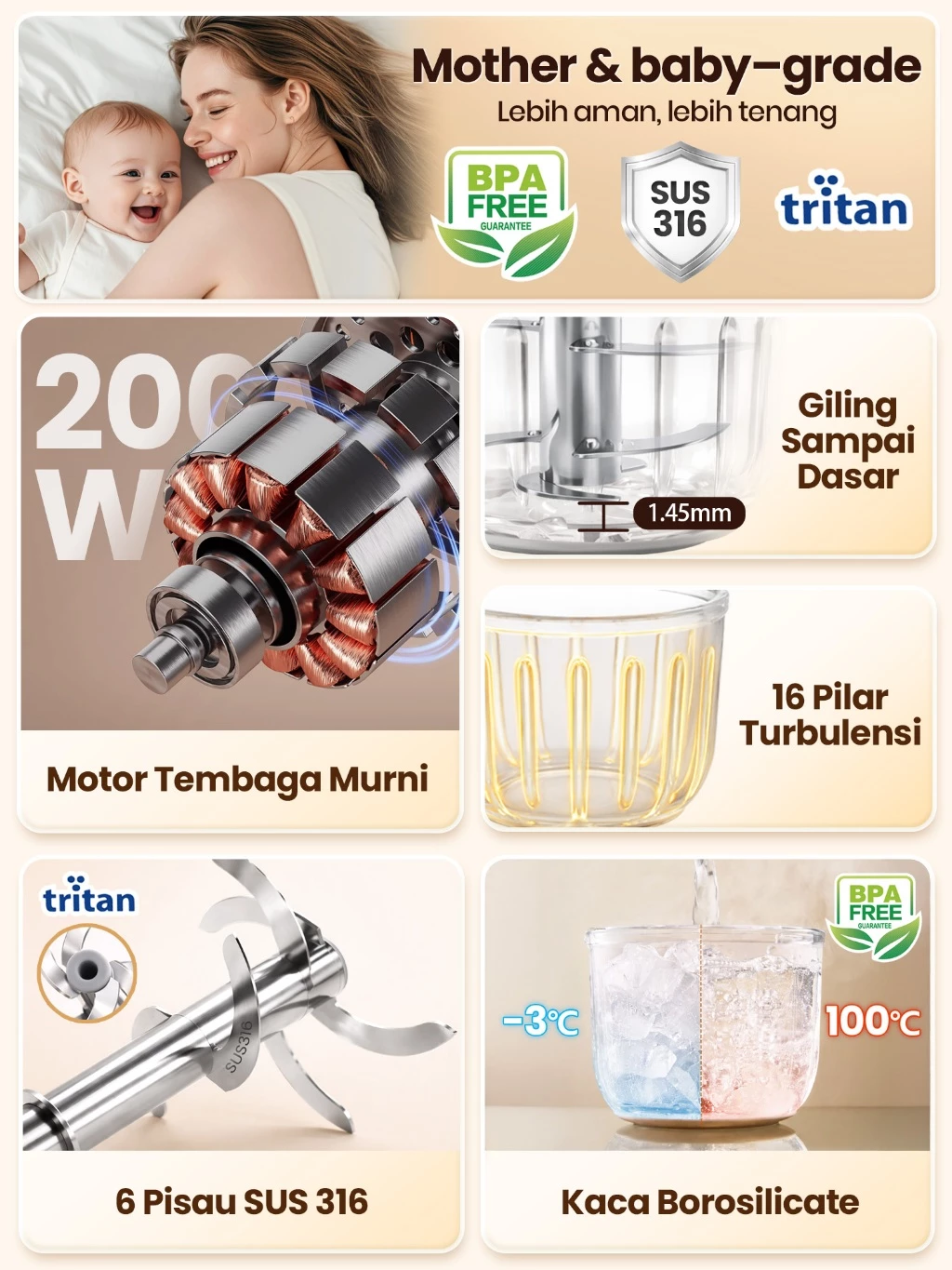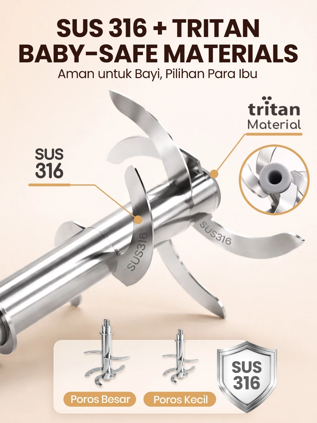 Komponen utama dengan SUS 316 Stainless Steel dan material Tritan bersertifikasi FDA & SGS, bebas BPA dan risiko mikroplastik. Dari poros pisau hingga mangkuk, seluruh bagian memenuhi standar keamanan bayi sekaligus ideal untuk kebutuhan masak harian keluarga — memasak jadi lebih aman, higienis, dan tenang.