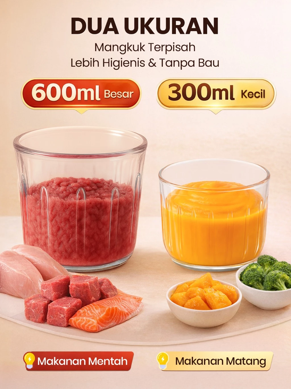 Dilengkapi 2 mangkuk terpisah (600 ml & 300 ml) untuk memisahkan bahan mentah dan matang — lebih higienis, rasa tetap terjaga, dan tercampur bau.