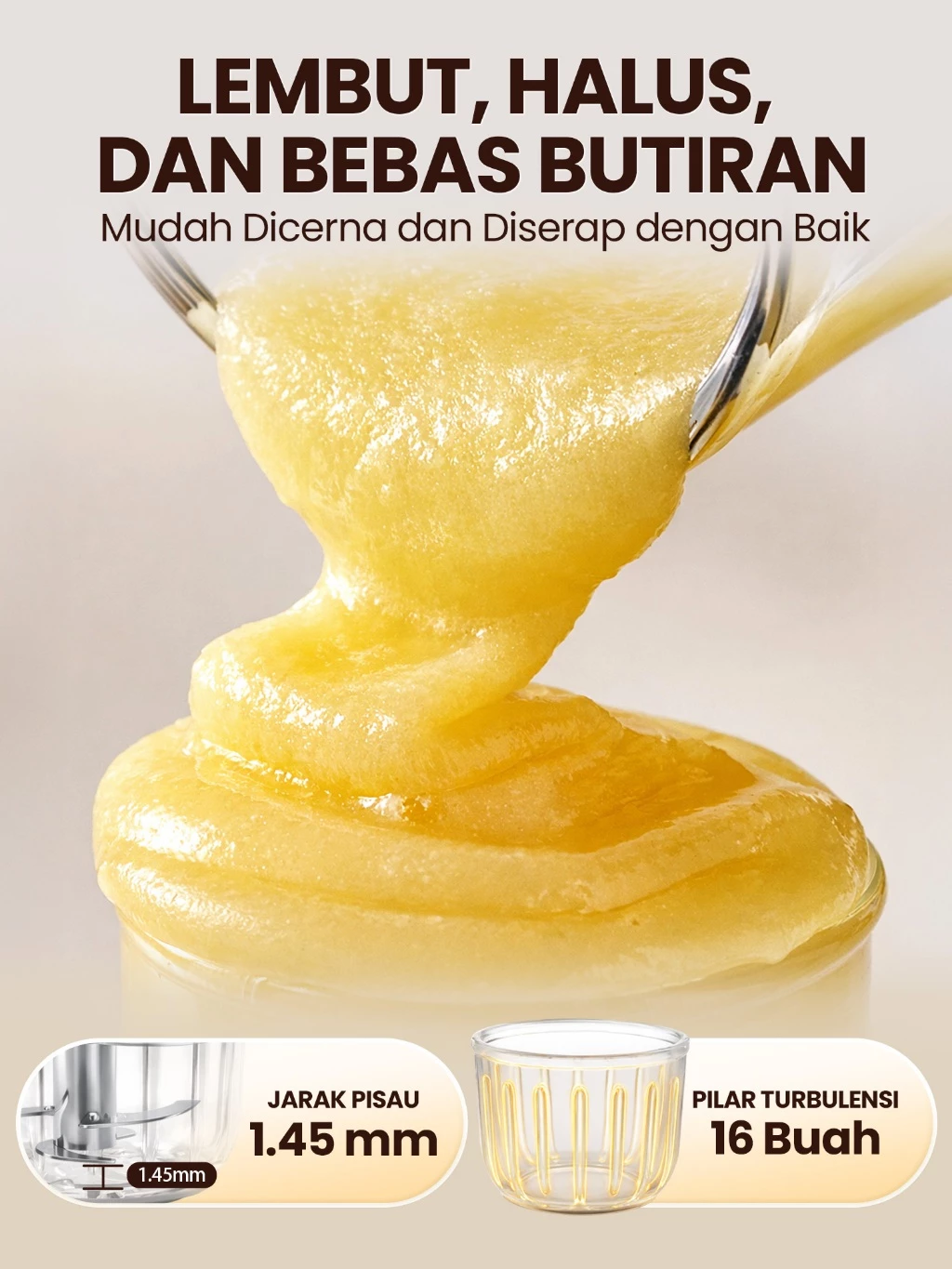 Dengan jarak pisau presisi 1.45 mm dan 16 pilar turbulensi, bahan digiling lebih halus. Tekstur lembut dan mudah diserap tubuh, cocok untuk MPASI maupun olahan sehari-hari seperti saus, bumbu, dan berbagai bahan makanan lainnya.