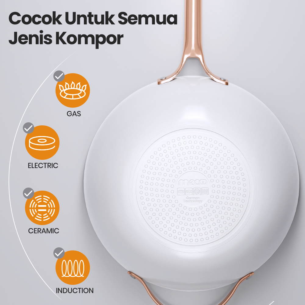 Panci anti lengket premium mecoo memiliki dasar komposit yang cocok untuk berbagai jenis kompor, termasuk gas, listrik, induksi, dan lainnya, memungkinkan penggunaan yang fleksibel dalam berbagai skenario memasak.