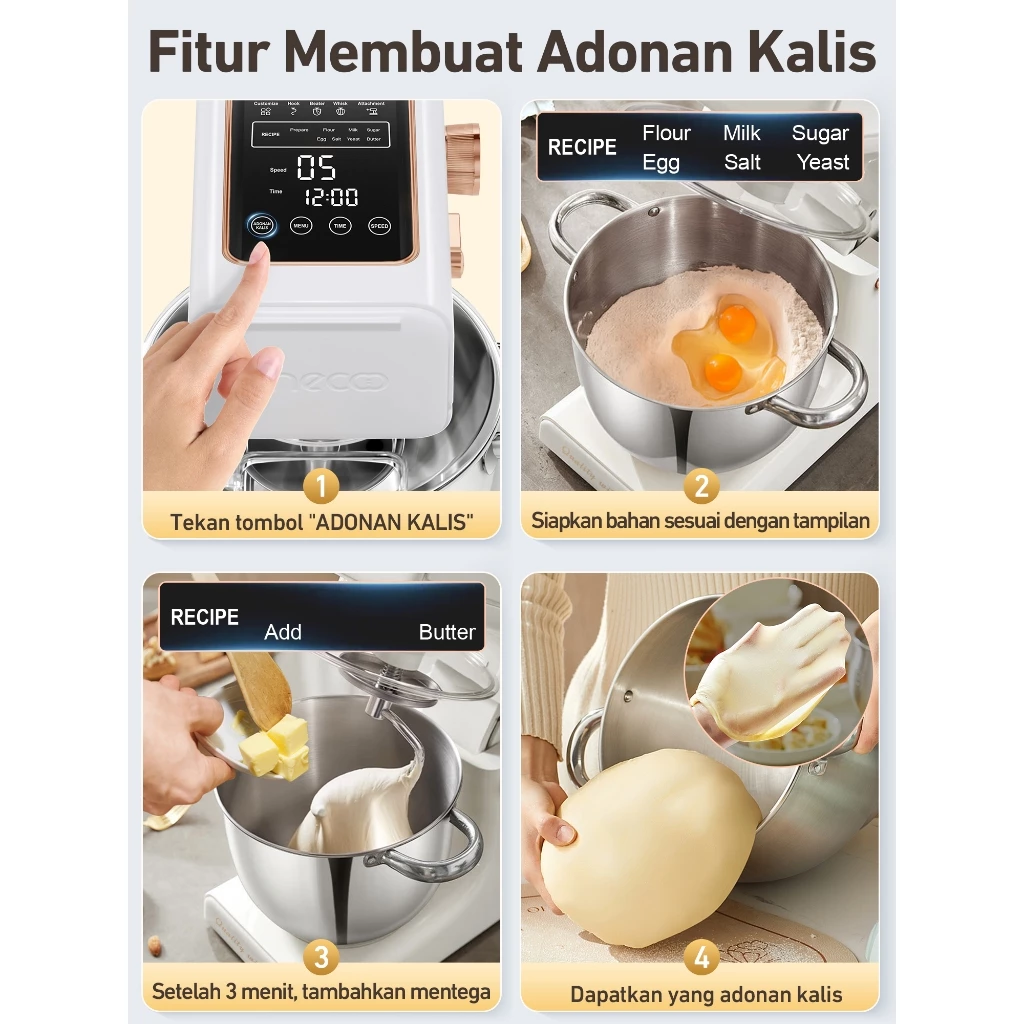 Stand Mixer Mecoo ini dilengkapi dengan layar sentuh digital yang memudahkan pembuatan roti hanya dengan satu sentuhan!